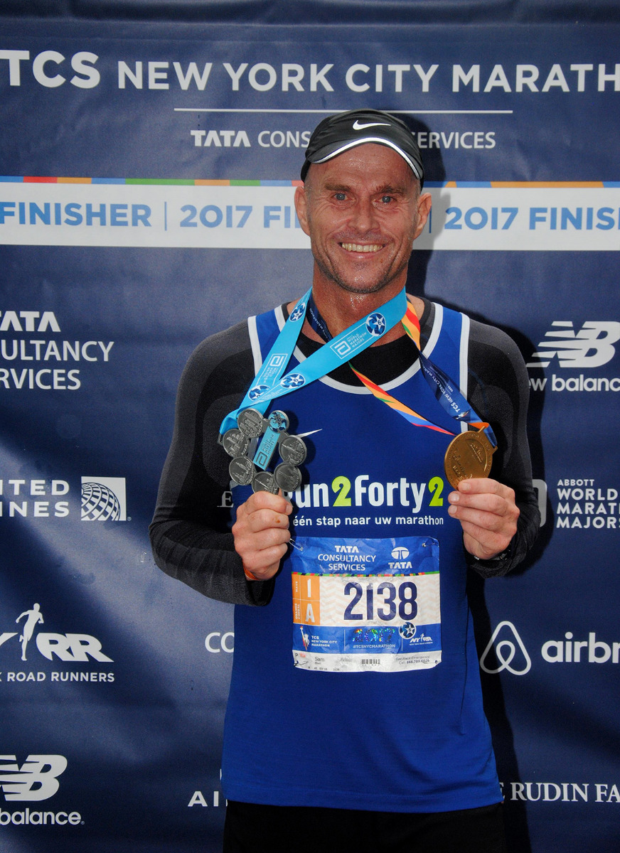 ‘Over die race kan en zal ik kort zijn. Het was 42 kilometer ellende. Voor mijn vertrek heeft in Nederland een tweede specialist uitgesloten en 100% bevestigd dat ik er niets blijvends mee kapot zou maken. Wel garandeerde hij me dat het een zware exercitie zou worden. Daar kreeg hij gelijk in. Maar 3 maanden na de finish in New York, rust, herstellen en opbouwen liep ik dit jaar al weer pijnvrij de marathon in Boston. Je weet wel die ene heroïsche in de storm, ik was daar bij,’ lacht de man met een groot marathonhart.