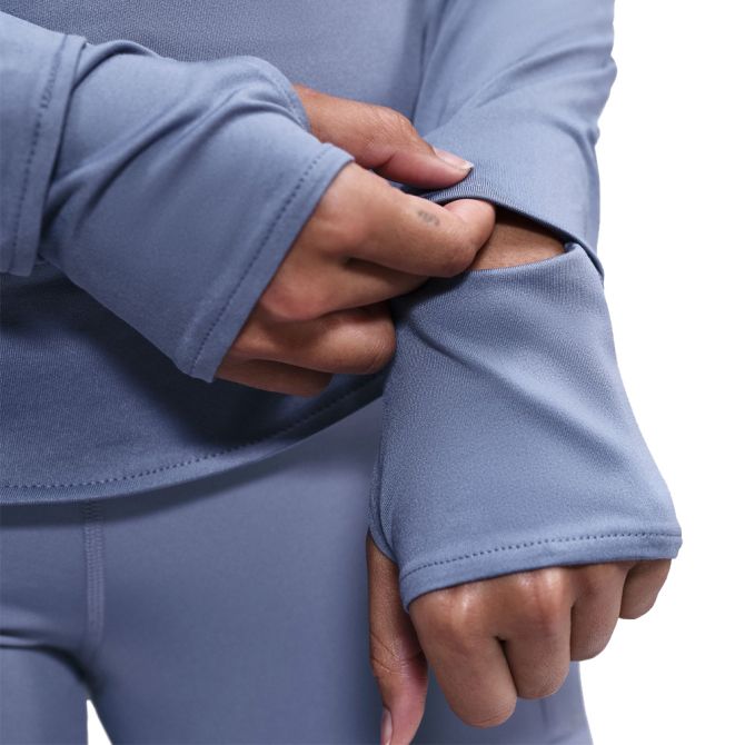 De top loopt taps toe rond de taille zodat je de top makkelijker met andere kledingstukken kunt combineren. De ronde zoom zorgt voor bedekking als je tot het uiterste gaat. De duimgaten bieden bovendien extra bedekking en houden de mouwen op hun plaats.